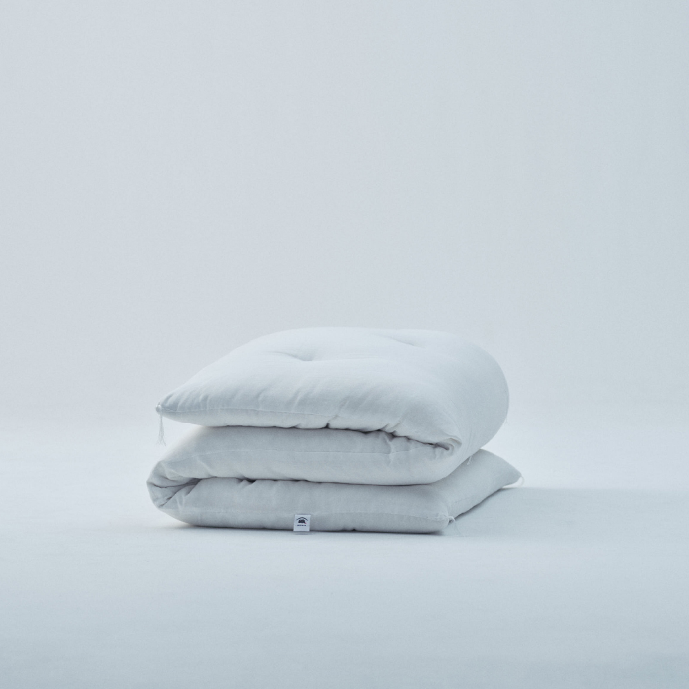 生地には四日間釜で熟成され不純物を丁寧に除去した和晒ダブルガーゼ生地を使用。肉厚な中わたをしっかりと包み込み、なめらかなタッチでお肌にも自然に馴染みます。