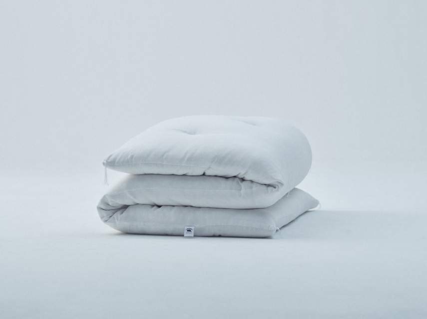 生地には四日間釜で熟成され不純物を丁寧に除去した和晒ダブルガーゼ生地を使用。肉厚な中わたをしっかりと包み込み、なめらかなタッチでお肌にも自然に馴染みます。