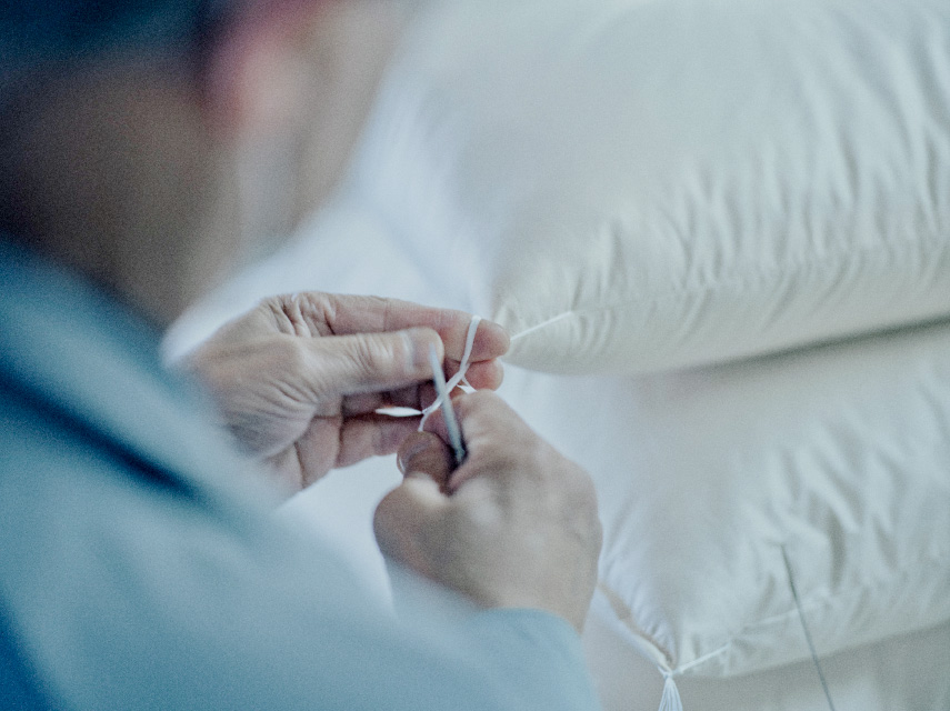 生地縫製からわた入れ作業まで、函館の自社工場にて職人がお作りしています。和布団特有のとじ部分の房(ふさ)もひとつひとつ手作業で丁寧に縫い付けています。
